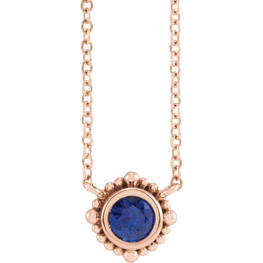 14k Rose Gold Round Shape 5mm Blue Sapphire Beaded Bezel-Set Solitaire Necklace (9.22x9.22mm), 18"