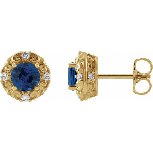 14k Yellow Gold 4mm Round Shape Lab-Grown Blue Sapphire and 1/8 cttw Diamond Stud Earrings