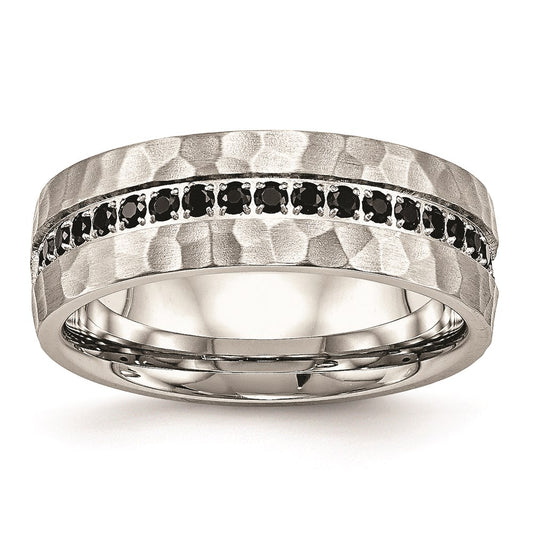 Stainless Steel Brushed and Polished Black Cubic Zirconia Hammered Ring, Size 8