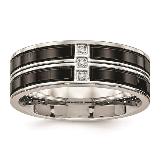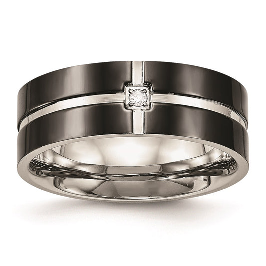 Stainless Steel Black Ion Plated Grooved Cubic Zirconia Comfort Back Ring, Size 10.5