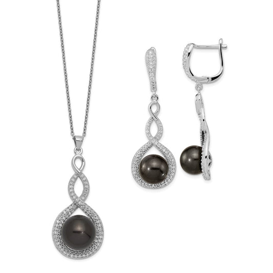 925 Sterling Silver Black Imitation Shell Pearl and Cubic Zirconia Earrings and Necklace Set (10-12mm), 17"