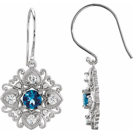14k White Gold London Blue Topaz and 1/2 cttw Diamond Vintage-Inspired Filigree Drop Dangle Earrings (G-H, I1)