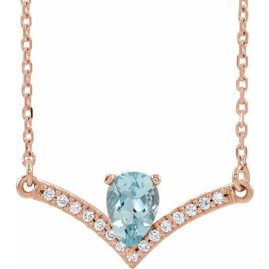 14k Rose Gold Pear Shape Aquamarine and .06 cttw Diamond Bar Necklace (G-H, I1, 19.81x8.29mm), 18"