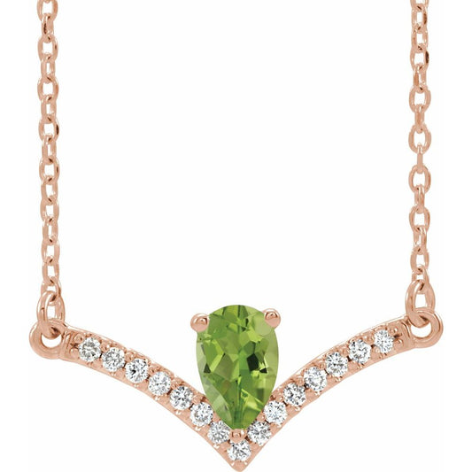 14k Rose Gold Pear Shape Peridot and .06 cttw Diamond Bar Necklace (19.8x8.2mm, G-H, I1), 16"