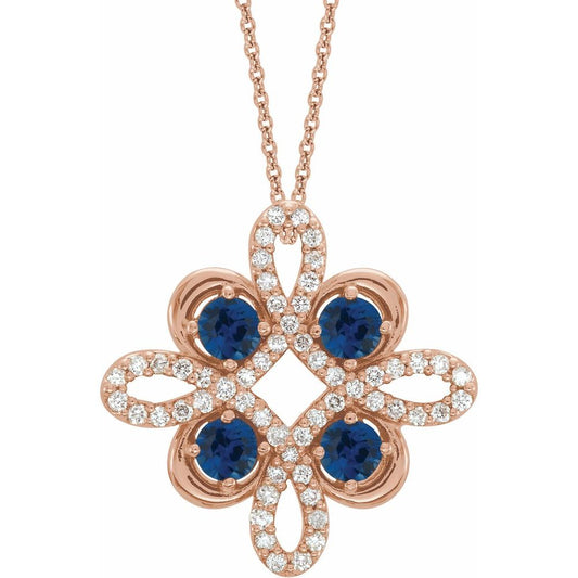 14k Rose Gold Round Shape Blue Sapphire and 1/6 cttw Diamond Clover Necklace (15.5x15.5mm), 16-18"