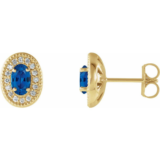 14k Yellow Gold Lab-Grown Blue Sapphire and 3/8 cttw Diamond Halo-Style Earrings (G-H)