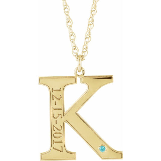 14k Yellow Gold Round Shape December Engraveable Birthstone Letter "K" Initial Personalized Necklace (18x18mm)