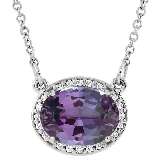 14k White Gold Oval Shape Lab-Grown Alexandrite and .05 cttw Diamond Halo-Style Necklace (11.2x11.6mm, G-H, I1), 16.5"