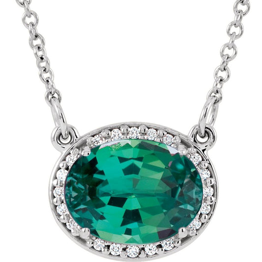 14k White Gold Oval Shape Lab-Grown Emerald and .05 cttw Diamond Halo-Style Necklace (11.2x11.6mm, G-H, I1), 16.5"