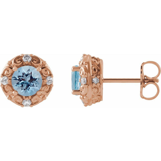 14k Rose Gold 6mm Round Shape Aquamarine Halo-Style Earrings