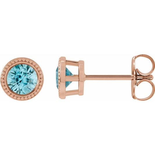 14k Rose Gold 6mm Round Shape Blue Zircon Beaded Bezel-Set Stud Earrings