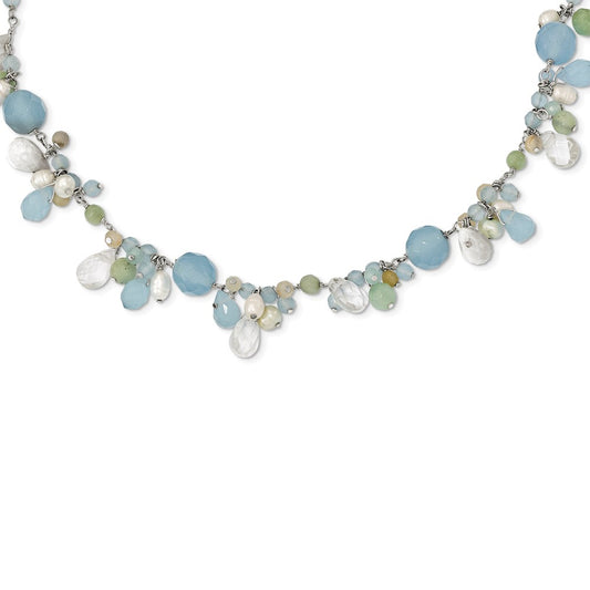925 Sterling Silver Swiss Blue Topaz/Crystal/Opalite Crystal/Amazonite/Freshwater Cultured Pearl Necklace, 16"