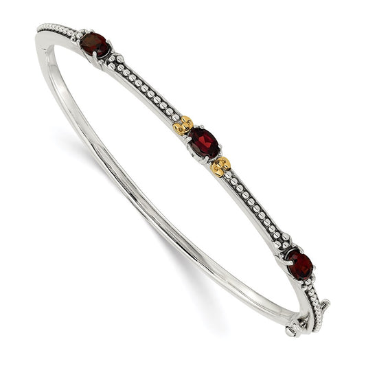 925 Sterling Silver and 14k Yellow Gold Garnet Bangle Bracelet, 7.25"