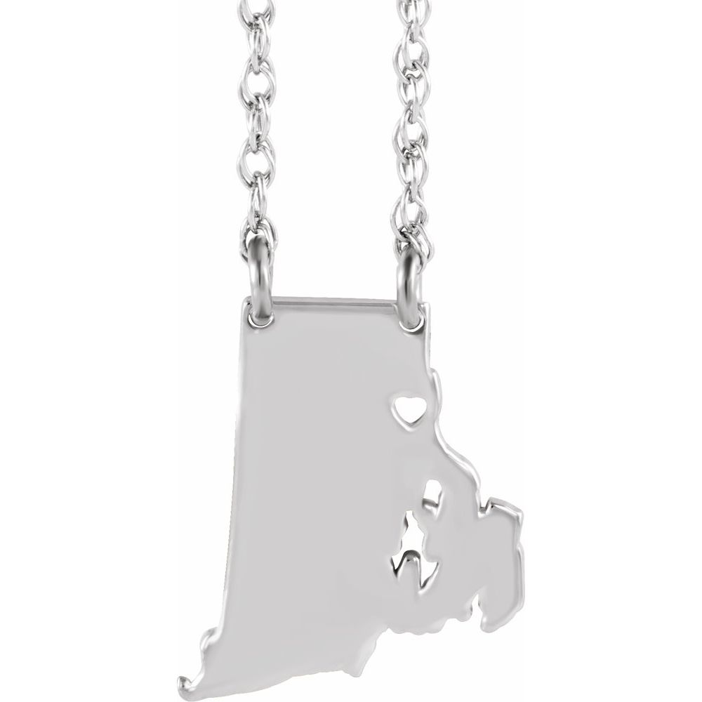 Description: 14k White Gold Rhode Island State with Heart-Pierced City Necklace