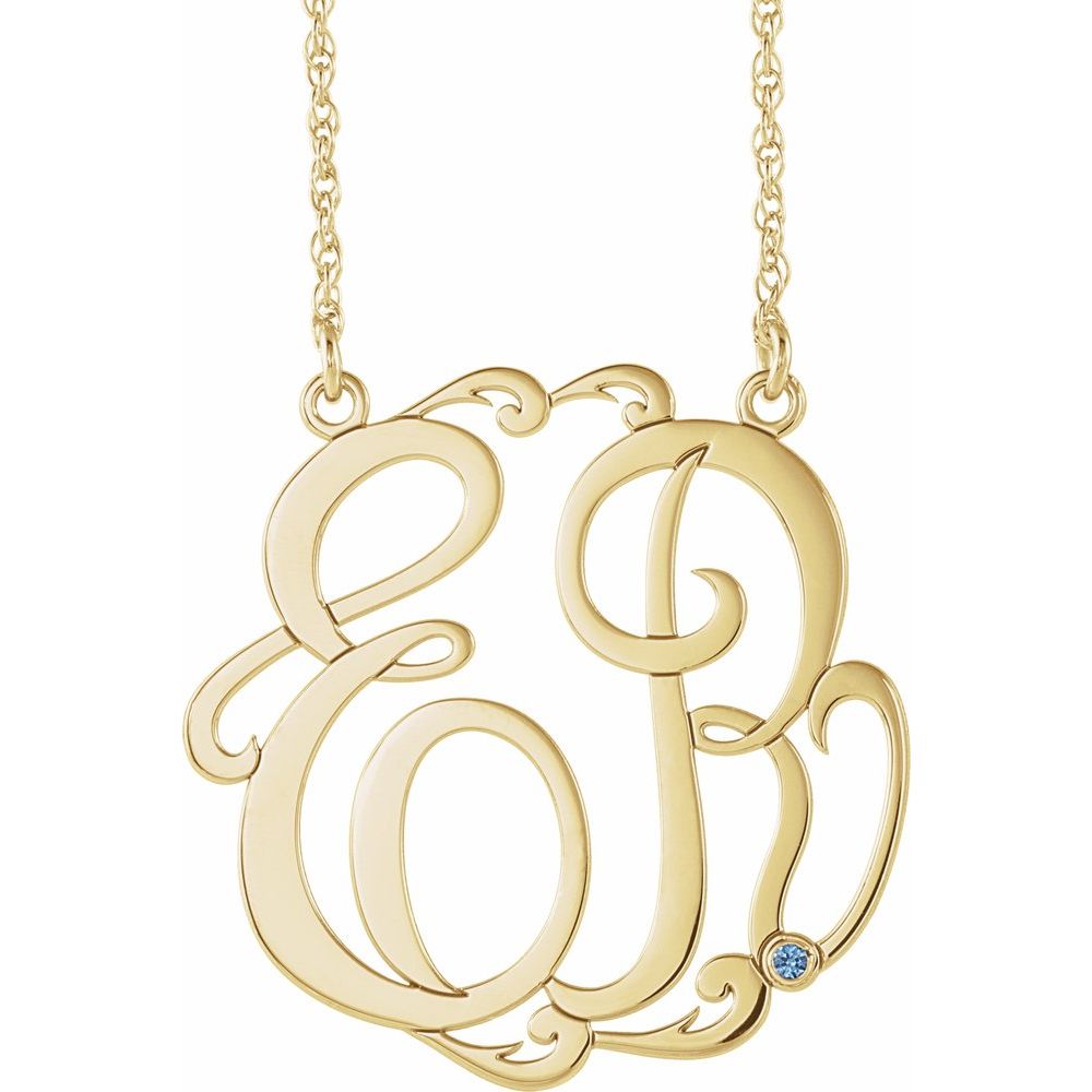 Description: 14k Yellow Gold 1.5mm Round Imitation Aquamarine 2 Initial Script 30mm Monogram Necklace