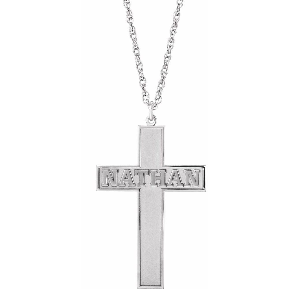 Description: 14k White Gold Block Nameplate Cross Necklace