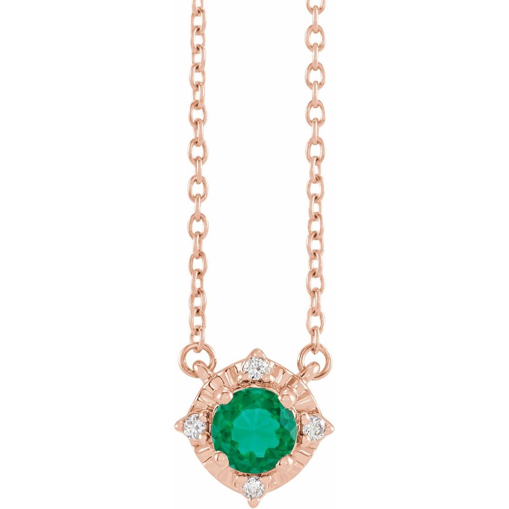 Description: 14k Rose Gold Lab-Created Emerald and .04 cttw Diamond Halo-Style 18" Necklace