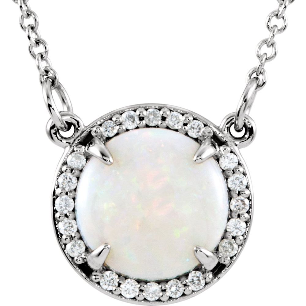 14k White Gold Round Shape Opal and .05 cttw Diamond Cabochon Necklace (12.5x10.9mm, G-H, I1), 16"
