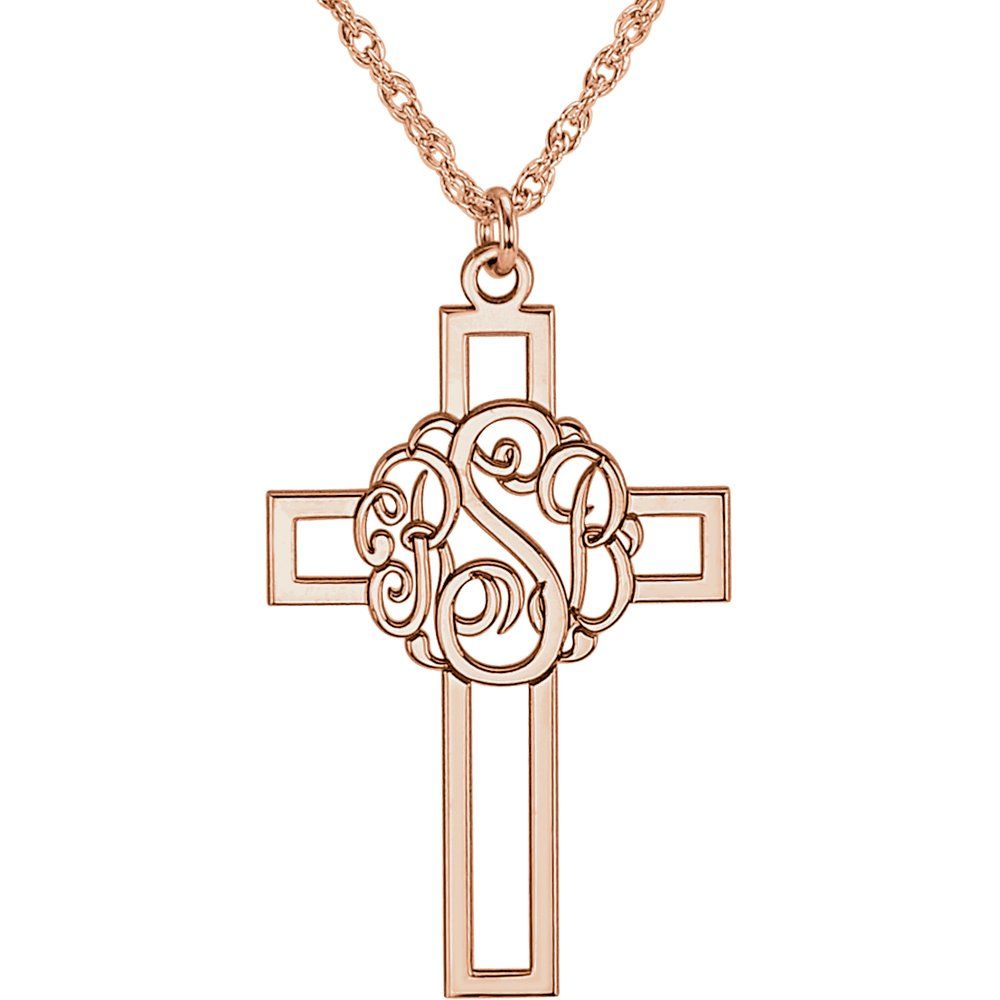 Description: 14k Rose Gold 29x19mm 3-Letter Script Monogram Cross Necklace