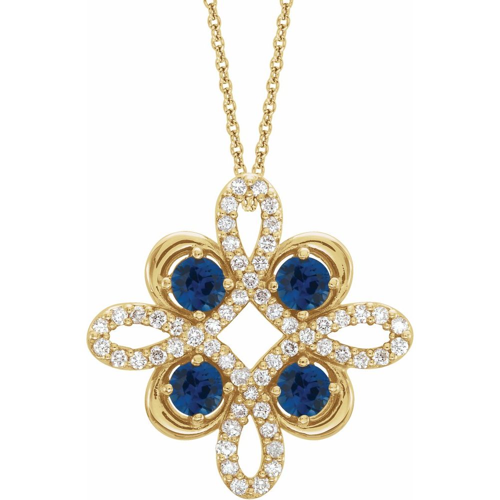 14k Yellow Gold Round Shape Blue Sapphire and 1/6 cttw Diamond Clover Necklace (15.5x15.5mm), 16-18"