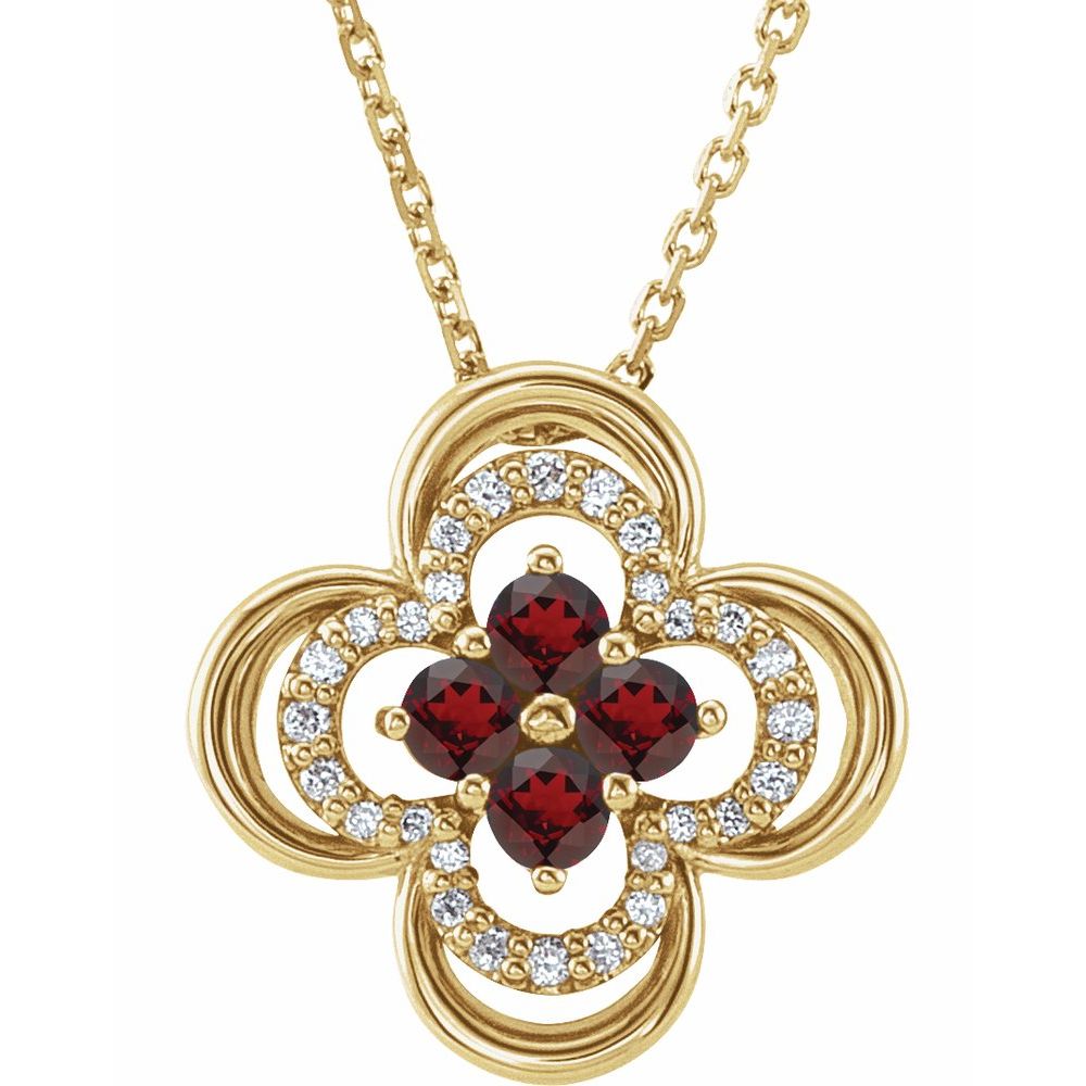 14k Yellow Gold Round Shape Mozambique Garnet and 1/10 cttw Diamond Clover Necklace (12.5x12.5mm, G-H, I1), 18"