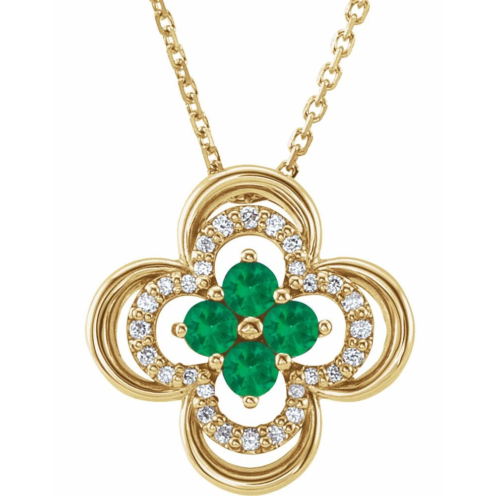 14k Yellow Gold Round Shape Emerald and 1/10 cttw Diamond Clover Necklace (12.5x12.5mm, G-H, I1), 18"