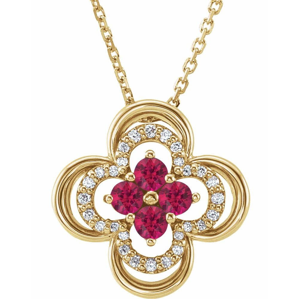 14k Yellow Gold Round Shape Ruby and 1/10 cttw Diamond Clover Necklace (12.5x12.5mm, G-H, I1), 18"