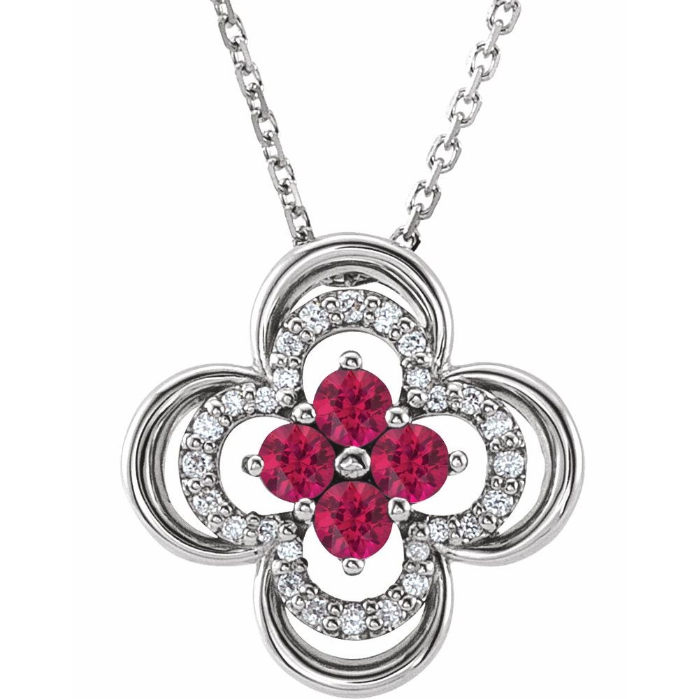 Description: 14k White Gold Lab-Grown Ruby and 1/10 cttw Diamond Clover 18" Necklace