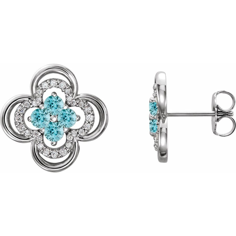 14k White Gold Blue Zircon and 1/5 cttw Diamond Clover Stud Earrings