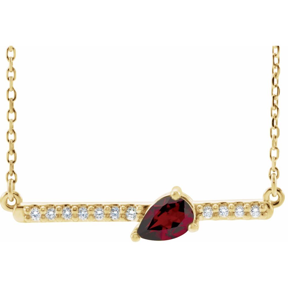 14k Yellow Gold Pear Shape Mozambique Garnet and 1/10 cttw Diamond Bar Necklace (G-H, I1, 27.52x5.24mm), 16"