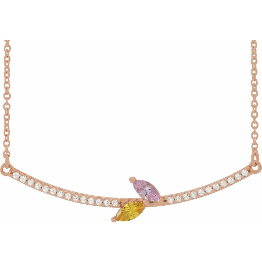 Description: 14k Rose Gold 2-Stone 1/10 cttw Diamond Semi-Set Family Curved Bar 18" Necklace