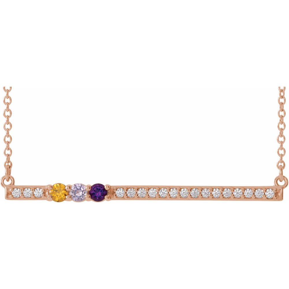Description: 14k Rose Gold 3-Stone 1/6 cttw Diamond Semi-Set Family Bar 16" Necklace