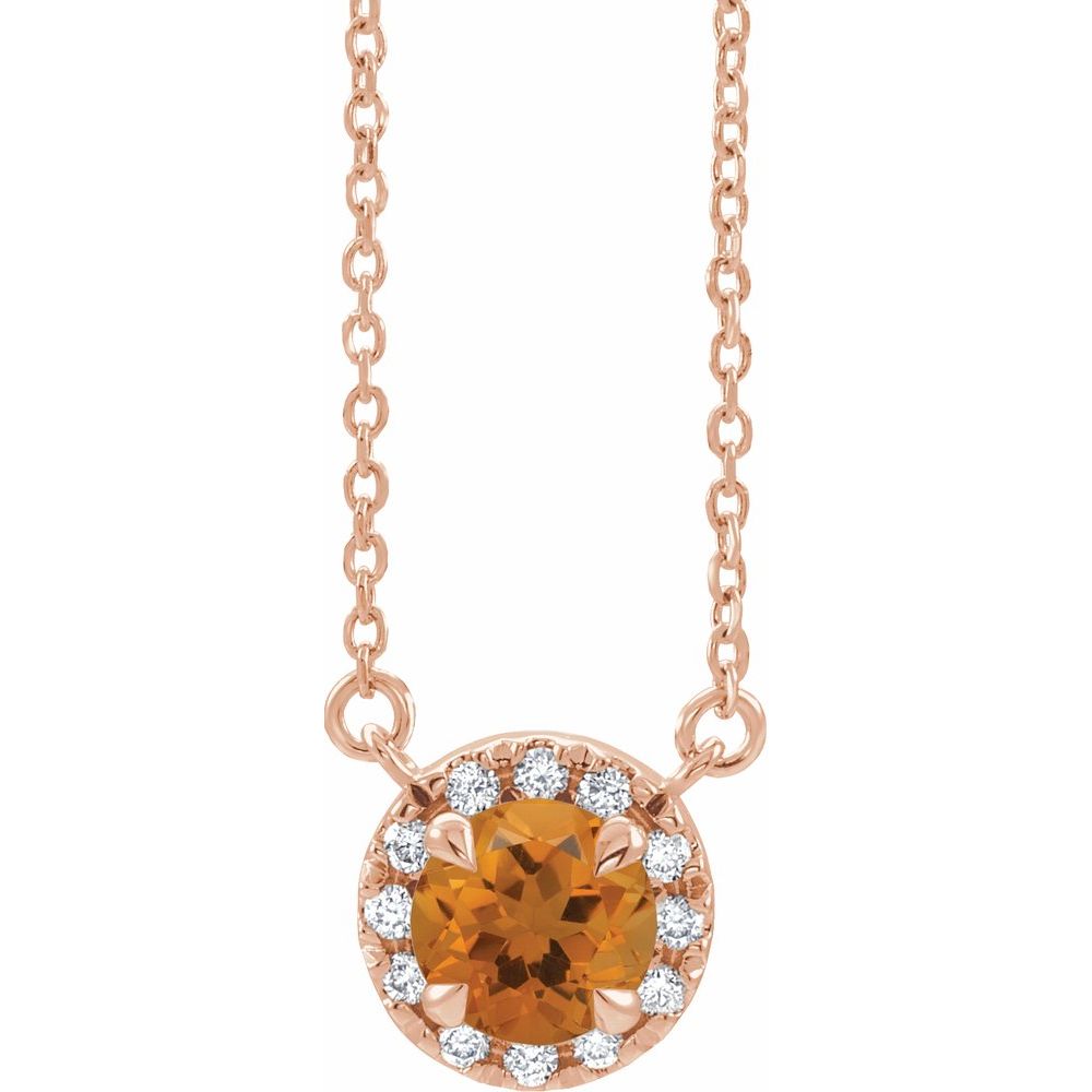 14k Rose Gold 4.5mm Round Shape Citrine and .06 cttw Diamond Halo-Style Necklace (7.6mm, G-H, I1), 16"