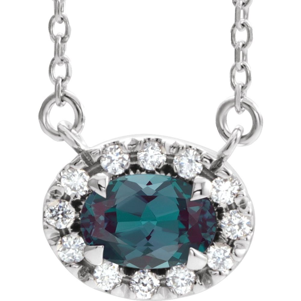14k White Gold 6x4mm Oval Shape Lab-Grown Alexandrite and 1/10 cttw Diamond Halo-Style Necklace (9.4x8.1mm, G-H, I1), 16"