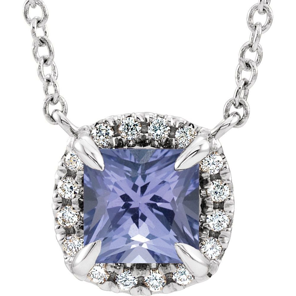 Sterling Silver 4x4mm Square Shape Tanzanite and .05 cttw Diamond Halo-Style Necklace (7.76x7.49mm, G-H, I1), 16"