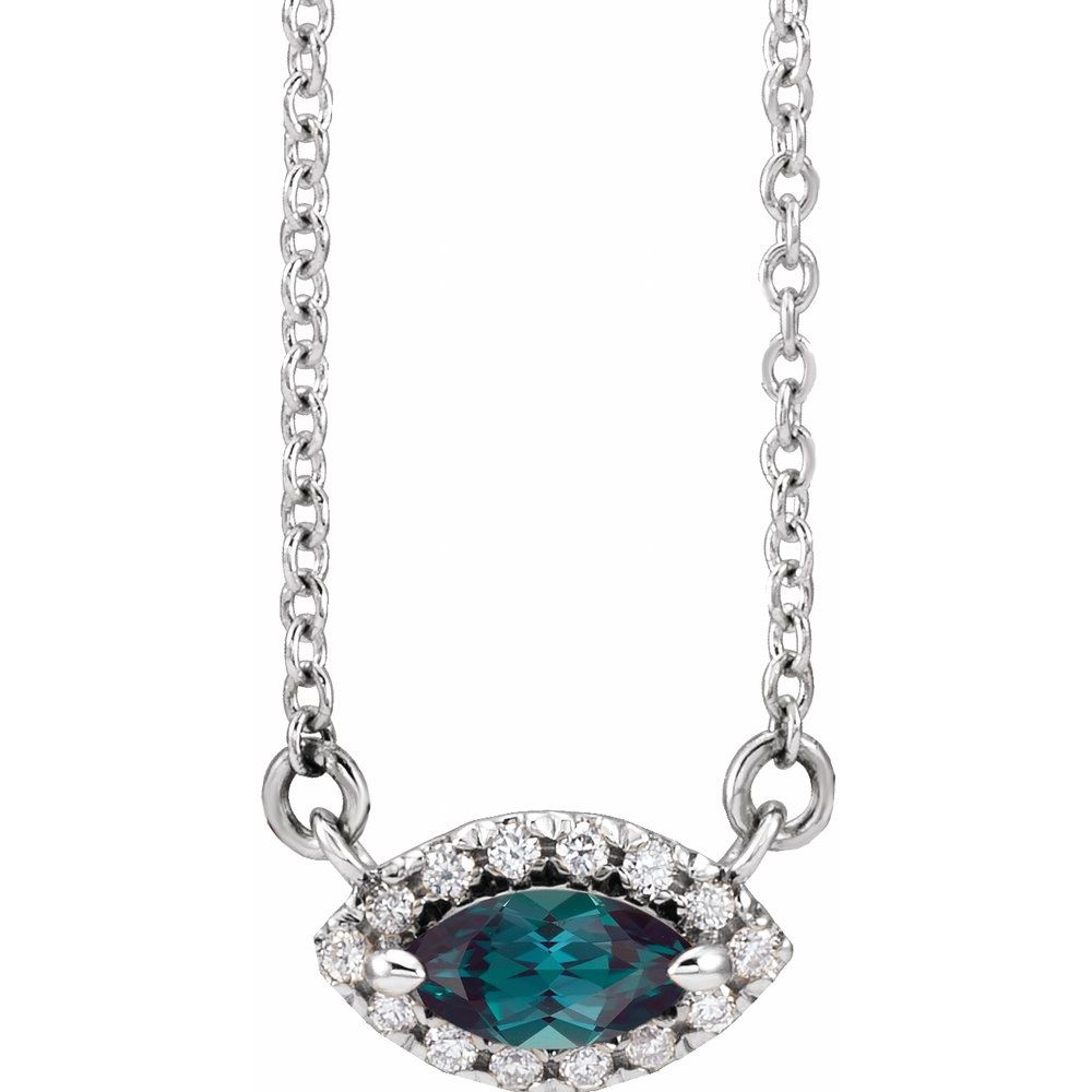 14k White Gold Marquise Shape Lab-Grown Alexandrite and .05 cttw Diamond Halo-Style Necklace (9.5x5.61mm, G-H, I1), 18"