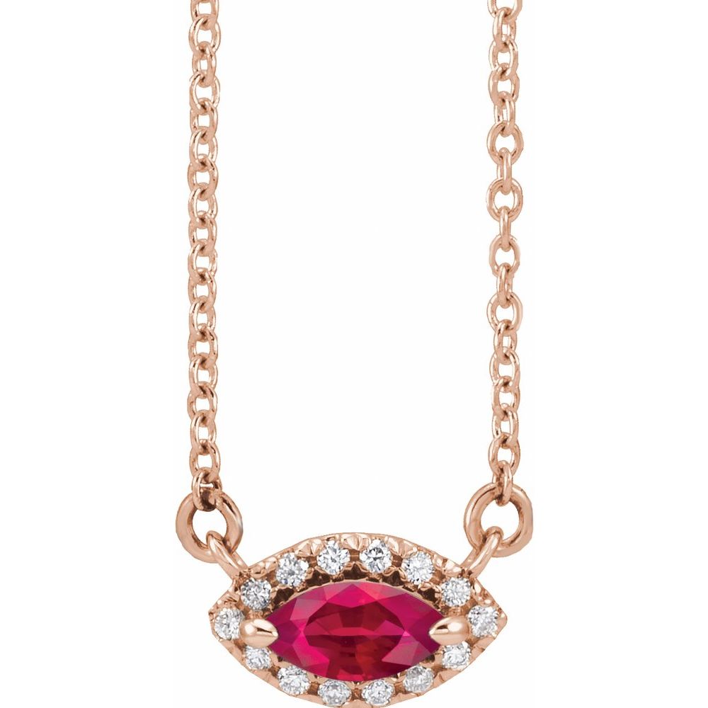 14k Rose Gold Marquise Shape Lab-Grown Ruby and .05 cttw Diamond Halo-Style Necklace (9.5x5.61mm, G-H, I1), 16"