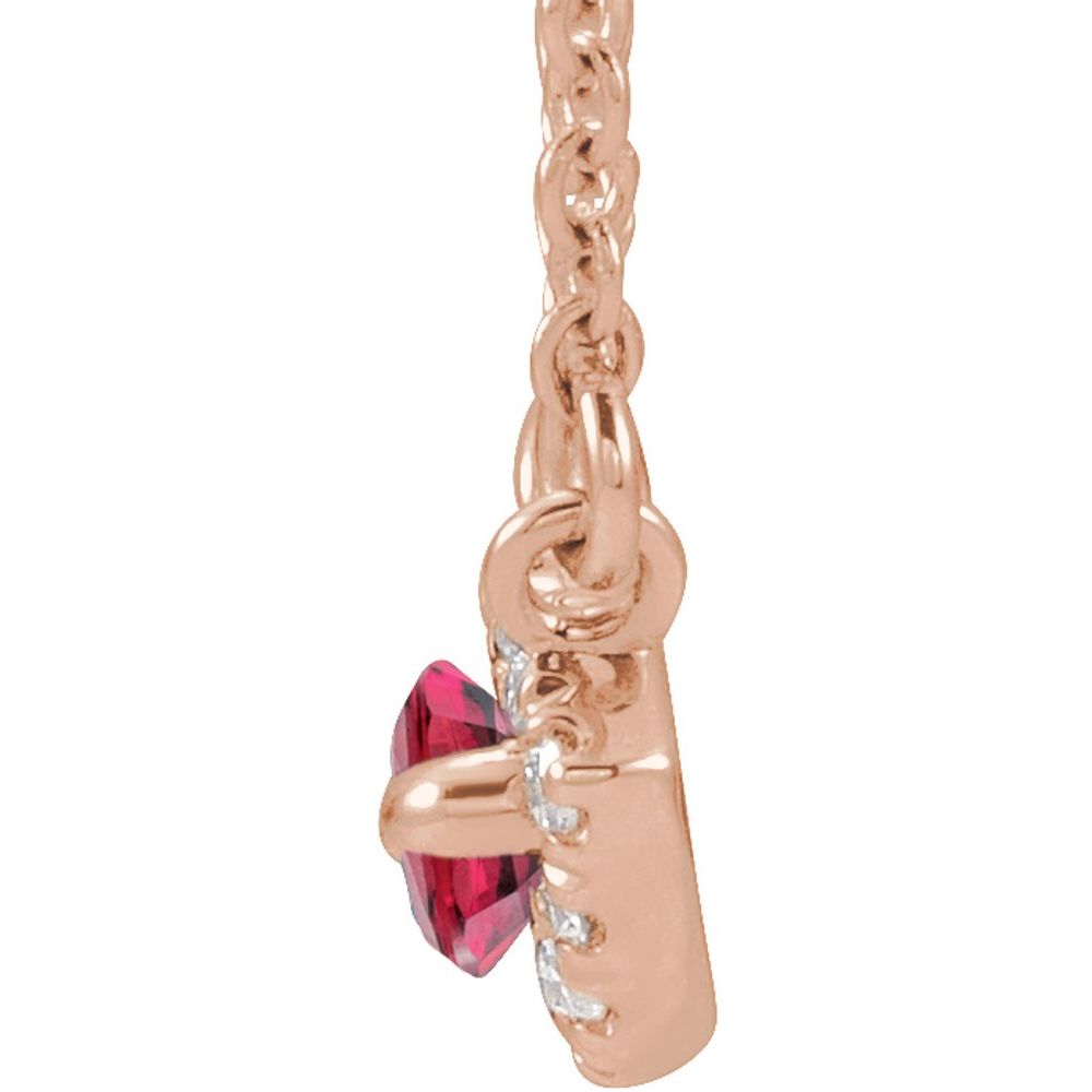 Description: 14k Rose Gold Lab-Grown Ruby and .05 cttw Diamond Halo-Style 16" Necklace