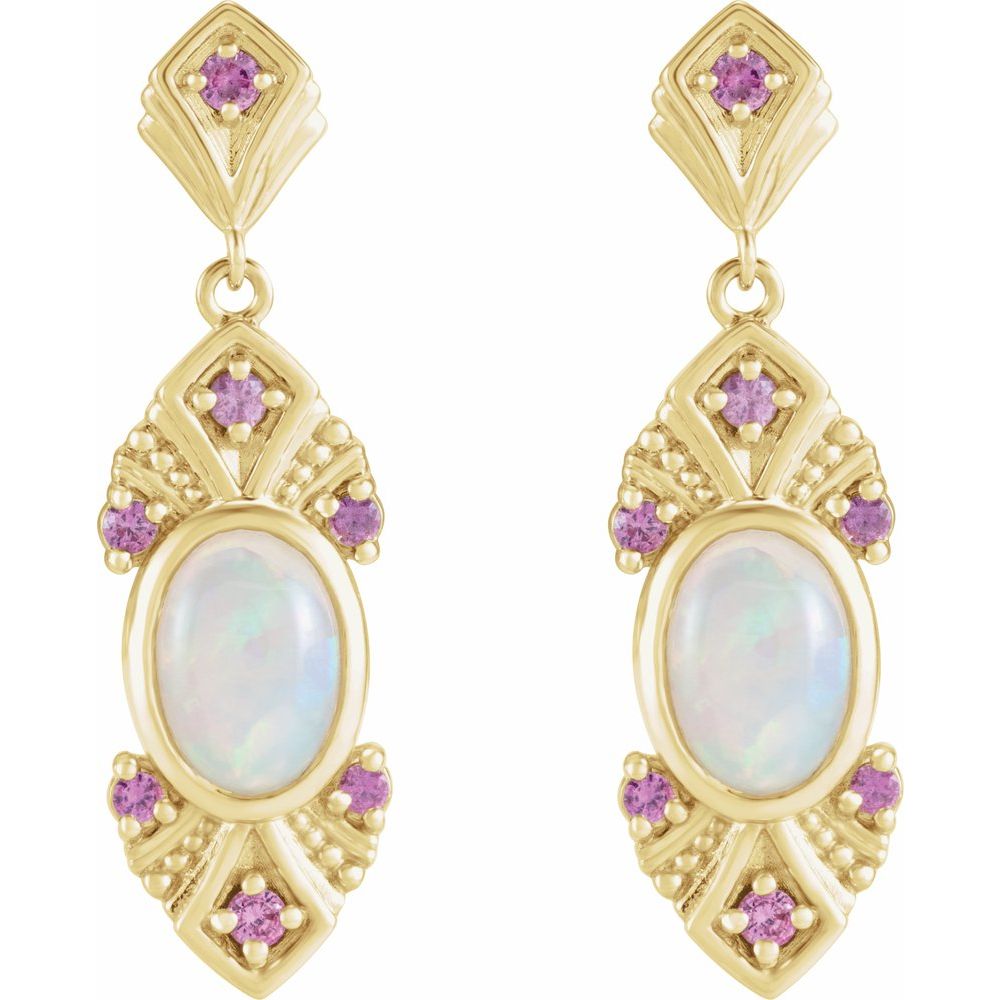 14k Yellow Gold Ethiopian Opal and Pink Sapphire Vintage-Inspired Drop Dangle Earrings (G-H, I1)