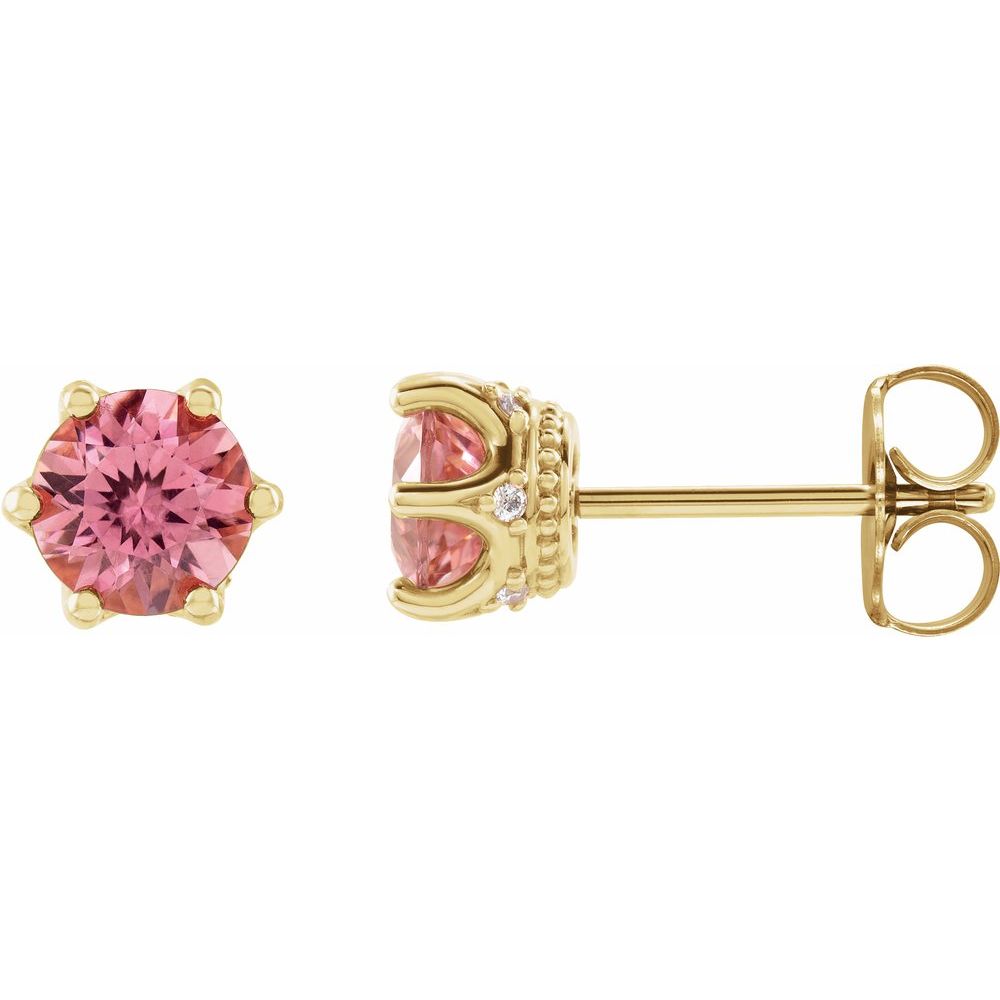14k Yellow Gold 4mm Pink Tourmaline and 0.03 cttw Diamond Crown Stud Earrings (G-H, I1)