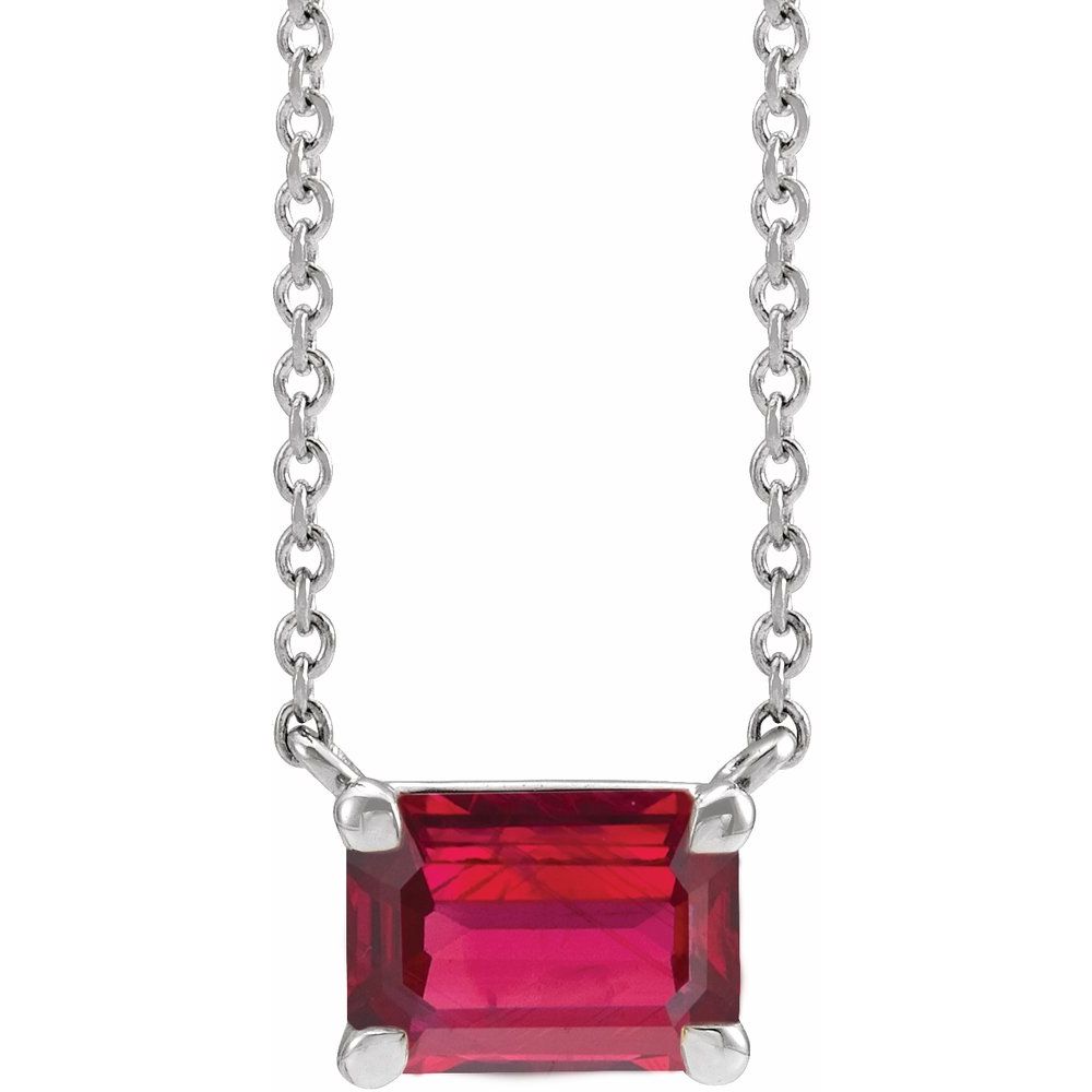 14k White Gold Emerald Cut Lab-Grown Ruby Claw Prong Solitaire Necklace, 18"