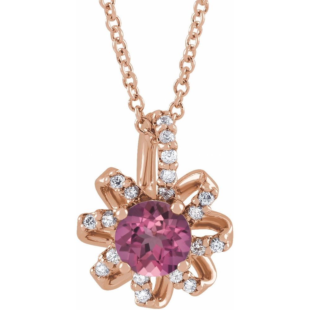 Description: 14k Rose Gold Pink Tourmaline and .07 cttw Diamond Halo-Style 16-18" Necklace
