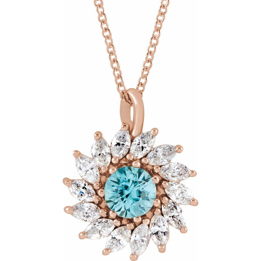 14k Rose Gold 5.5mm Round Shape Blue Zircon and 3/4 cttw Diamond Halo-Style Necklace (17.33x13.79mm, G-I, I1), 16-18"