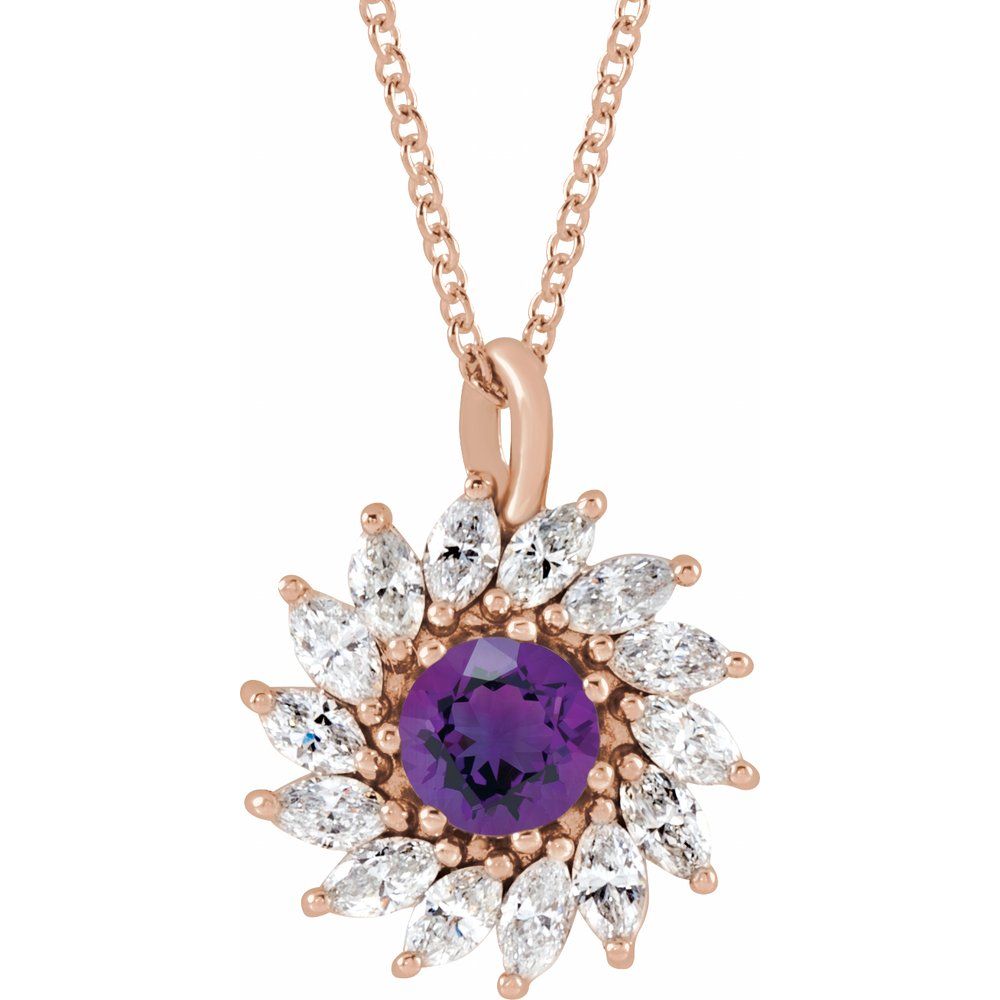 Description: 14k Rose Gold 6mm Round Amethyst and 3/4 cttw Diamond Halo-Style 16-18" Necklace