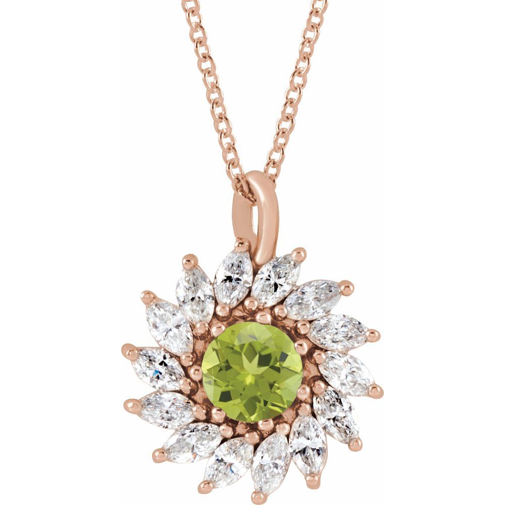 14k Rose Gold 3.5mm Round Shape Peridot and 1/2 cttw Diamond Halo-Style Necklace (17.25x13.62mm, G-I, I1), 16-18"