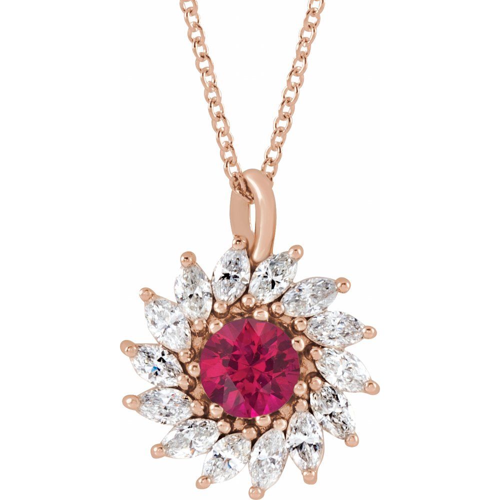 14k Rose Gold 3.5mm Round Shape Lab-Grown Ruby and 1/2 cttw Diamond Halo-Style Necklace (17.25x13.62mm, G-I, I1), 16-18"