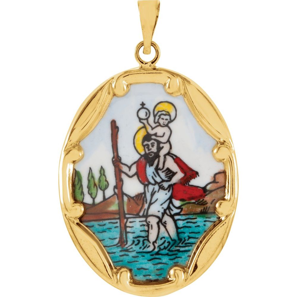 14k Yellow Gold Saint Christopher Hand-Painted Porcelain Medal Religious Pendant (25x19.5mm)