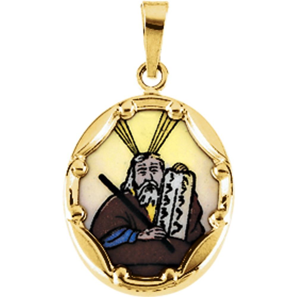 14k Yellow Gold Moses Hand-Painted Porcelain Saint Medal Religious Pendant (17x13.5mm)