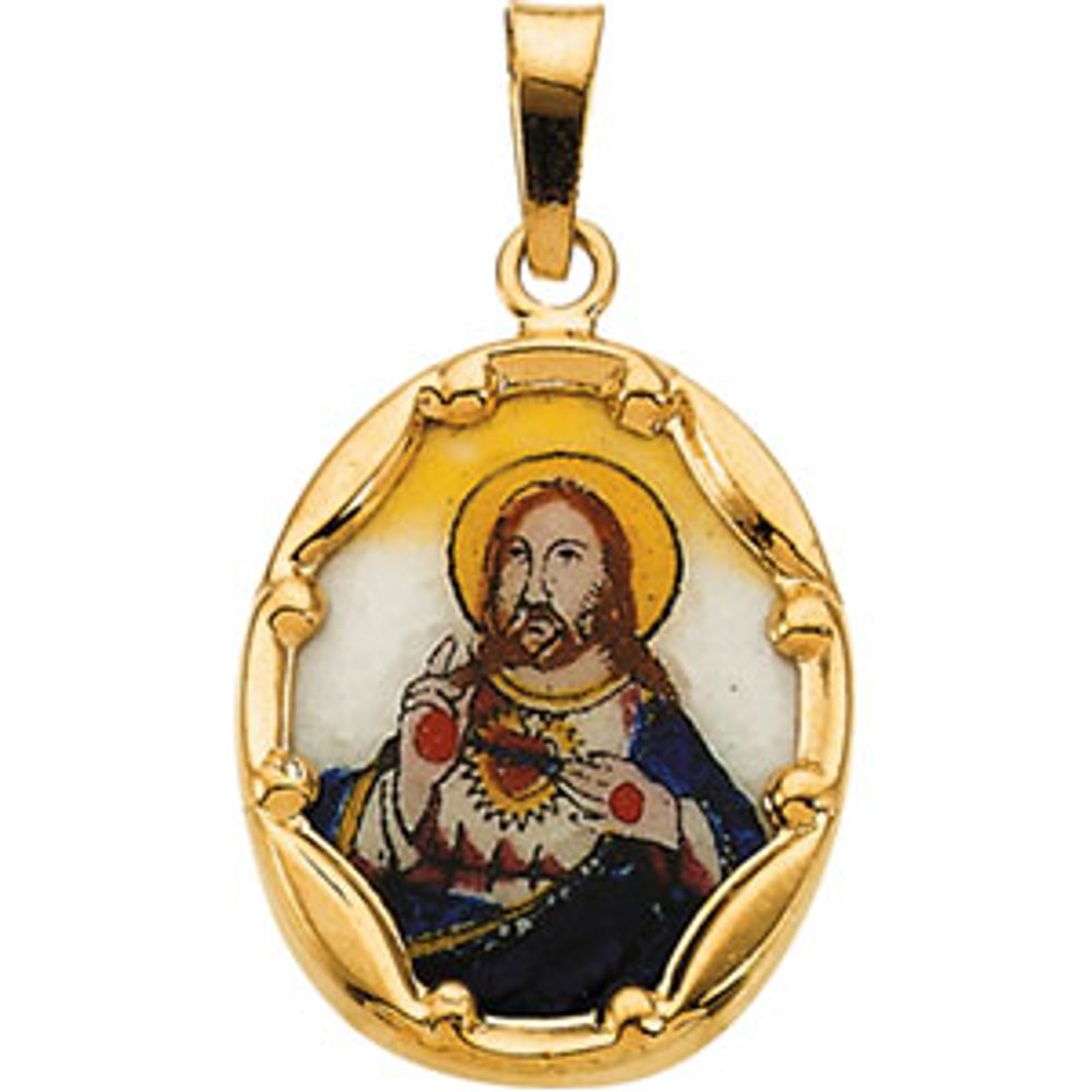 Description: 14k Yellow Gold 17x13.5mm Sacred Heart of Jesus Hand-Painted Porcelain Pendant