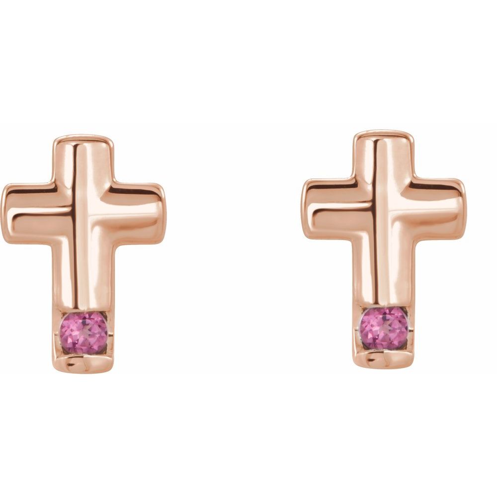 14k Rose Gold Pink Tourmaline Cross Religious Earrings